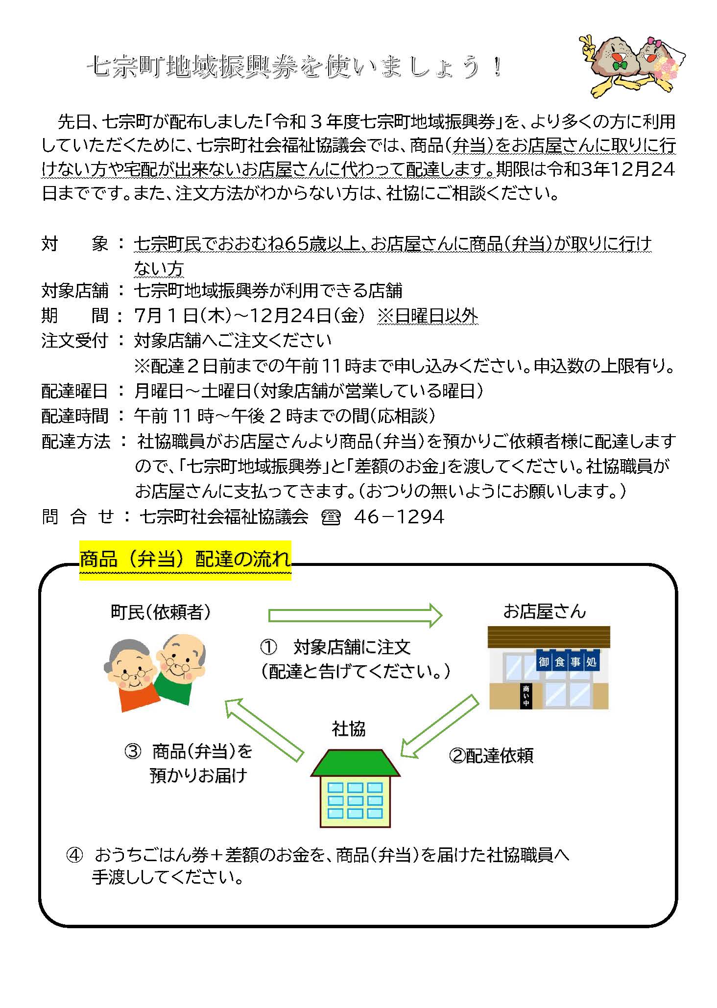 先日、七宗町が配布しました「令和3年度七宗町地域振興券」を、より多くの方に利用していただくために、七宗町社会福祉協議会では、商品(弁当)をお店屋さんに取りに行けない方や宅配が出来ないお店屋さんに代わって配達します。期限は令和3年12月24日までです。また、注文方法がわからない方は、社協にご相談ください。